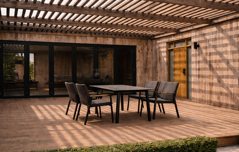 Large sliding glass doors open onto a generous private, partially shaded deck with lounge seating — perfect for morning coffee or relaxed evenings outdoors.