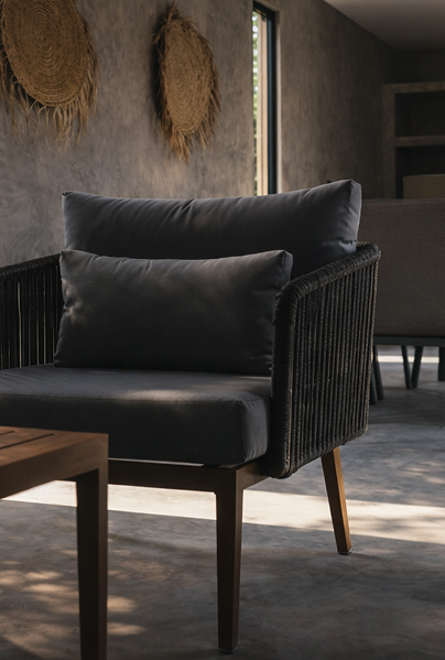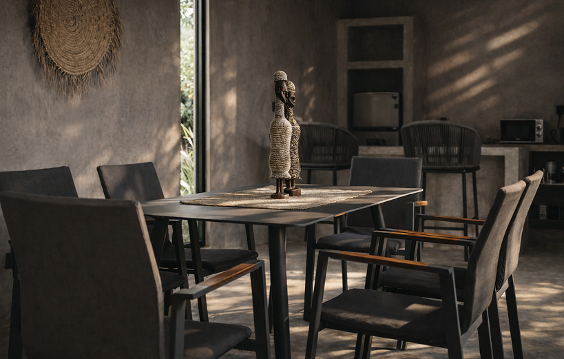 Concrete floors, raw timber, woven accents, and muted tones create a calm atmosphere shaped by curated soundscapes and the rhythm of nature.