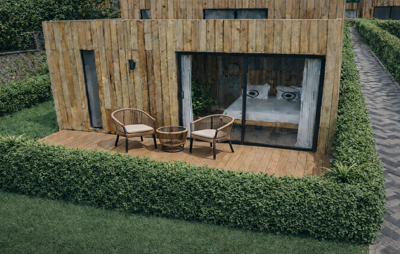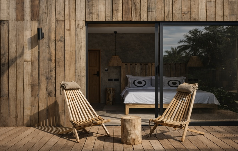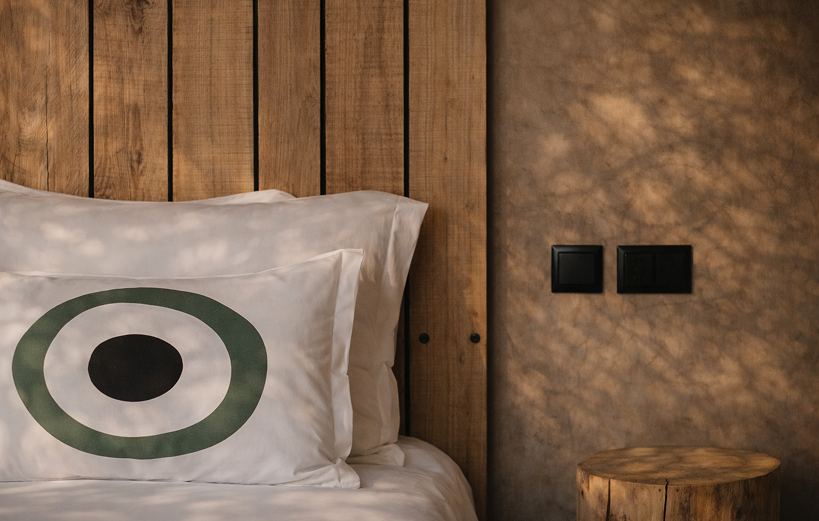 Concrete floors, woven accents, raw timber, and muted natural hues create a grounded, tactile atmosphere. There are no televisions here — only curated soundscapes and the gentle rhythm of nature, encouraging you to fully disconnect and unwind.