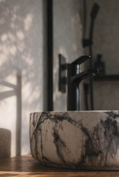 The en-suite bathroom features a walk-in rain shower, stone textures, and thoughtful details that elevate the everyday ritual.